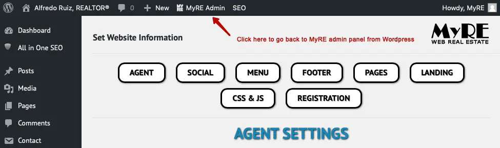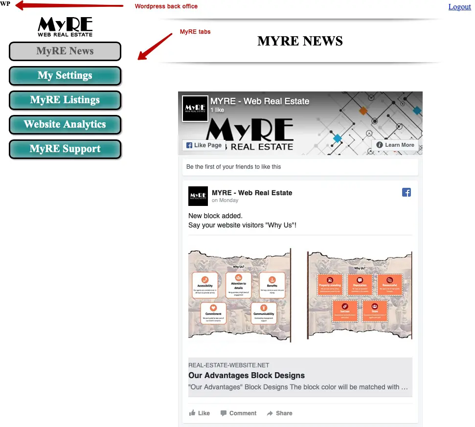 Once you’re logged in, you can view MyRE news, manage your listings, or go to the WordPress admin panel.